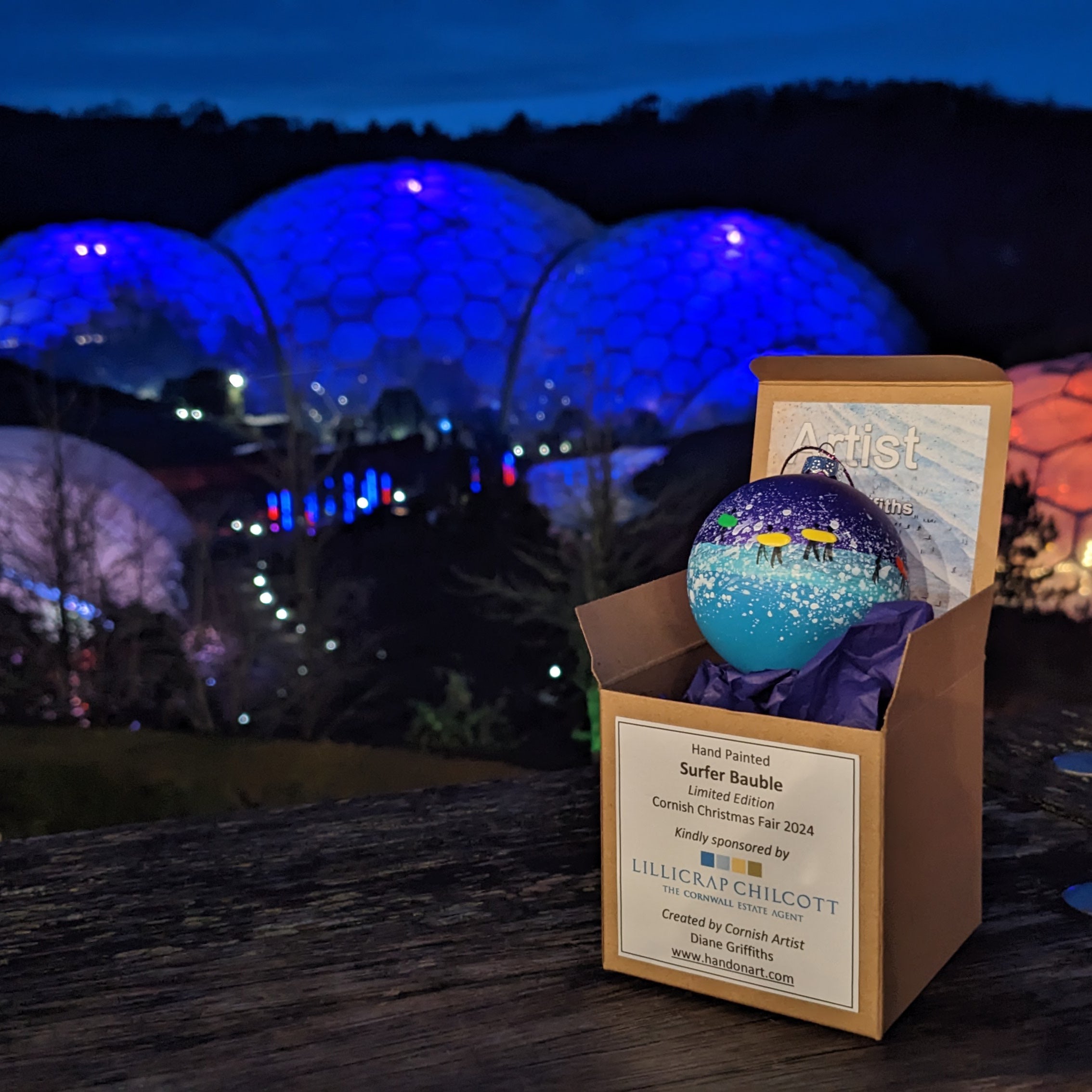Limited Edition sponsored bauble by Lillicrap Chilcott for Cornwall Community Foundation at The Eden Project Cornwall Christmas Fair.