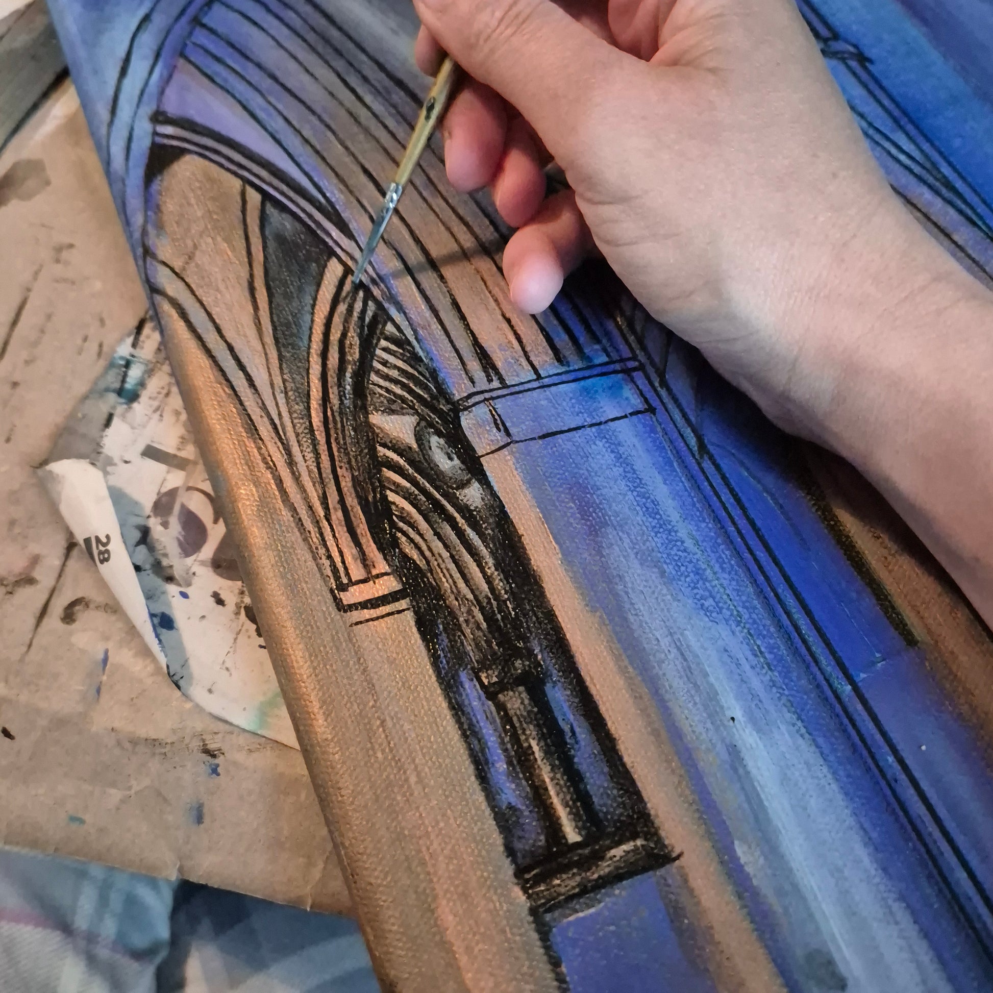 This painting is based on a visit to Truro Cathedral, back in 2023, to see the Gaia installation. There was something about the huge earth hanging suspended within the gothic arches of the cathedral which really caught my attention. The clash between the tall arches, subtlety lit in blue, against the vision of the world pulling focus.